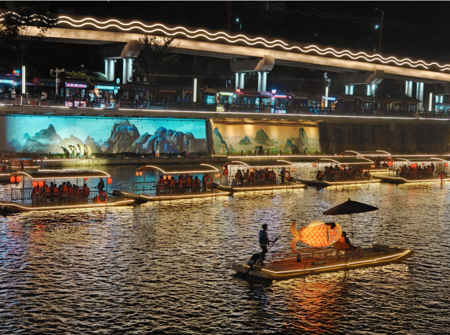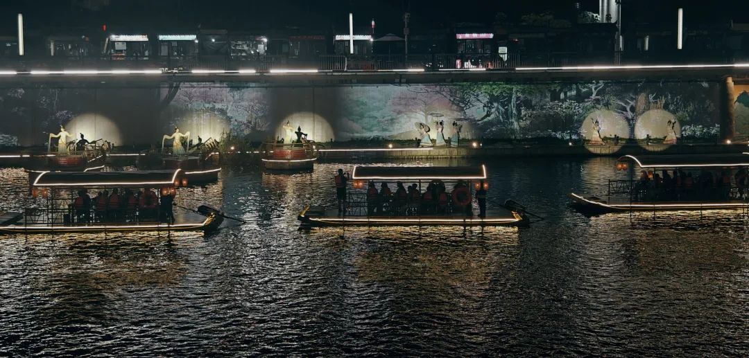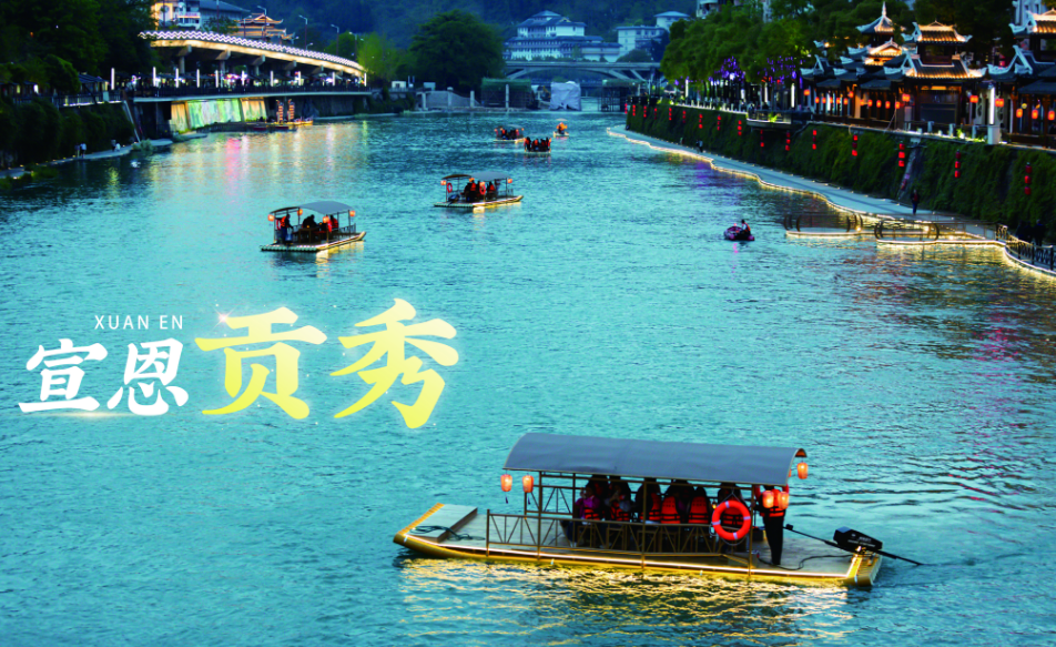 宣恩贡秀也是夜游仙山贡水旅游区的一大亮点,它巧妙地将现代光影科技与传统舞蹈表演相结合,为游客呈现了一场视觉与文化的盛宴。乘船游览贡水河,游客可以沉浸式感受贡水河的夜幕浪漫,体验“偷得浮生半日闲”的惬意闲适。